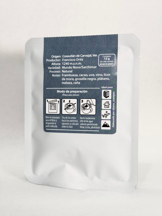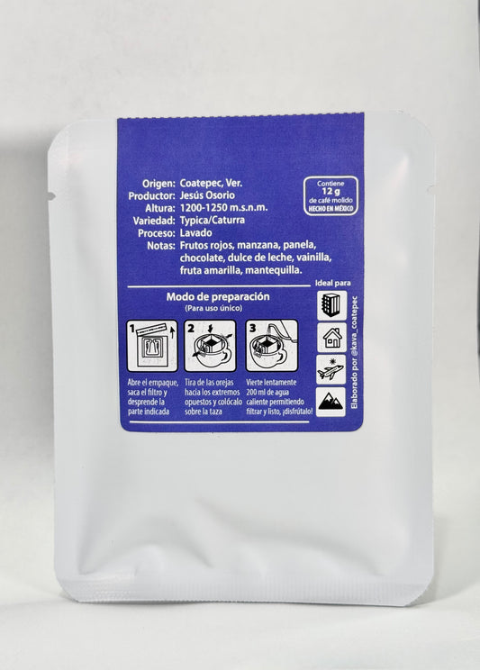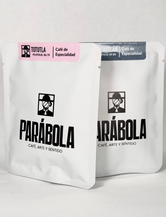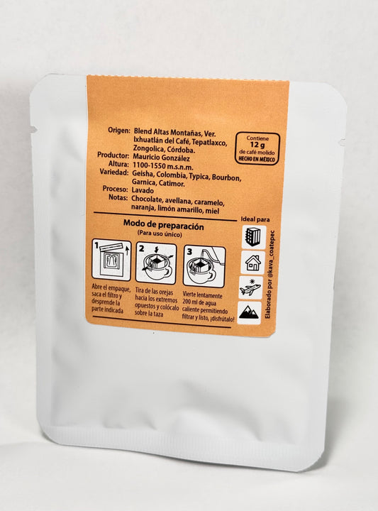 Drippers de uso único. Ideal para viajes, camping, oficina o lectura. Cada uno contiene 12 g de café molido listo para filtrado. Necesitas una taza y agua caliente, vierte el agua en el dripper y obtén tu café fltrado. No necesitas cafetera. Lleva Parábola donde tú prefieras.