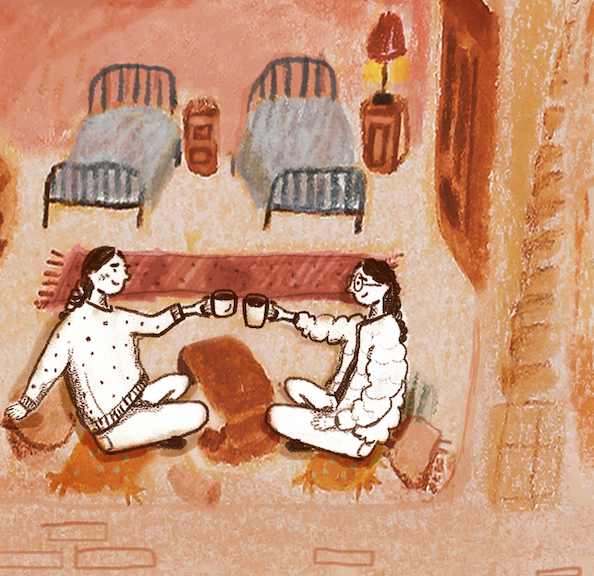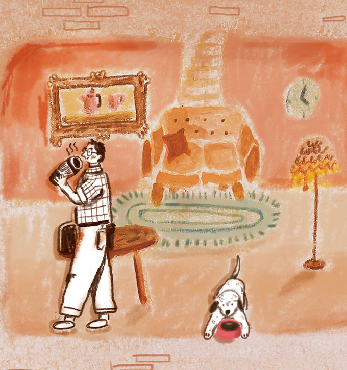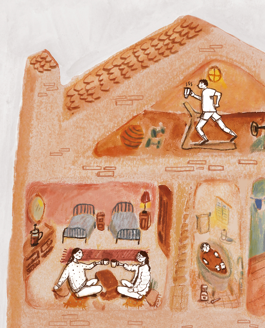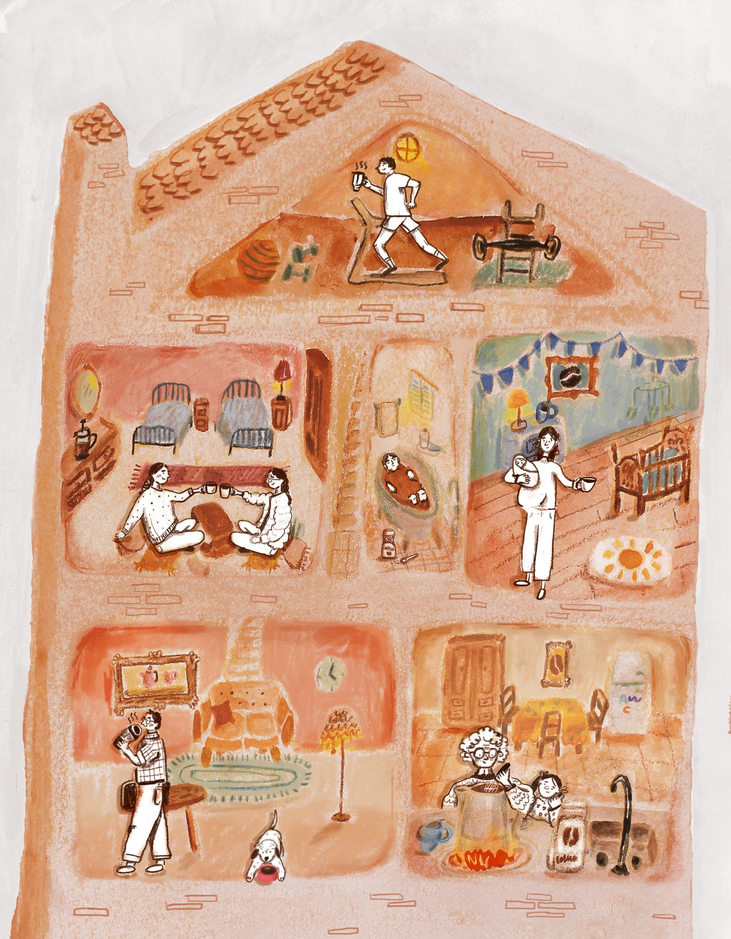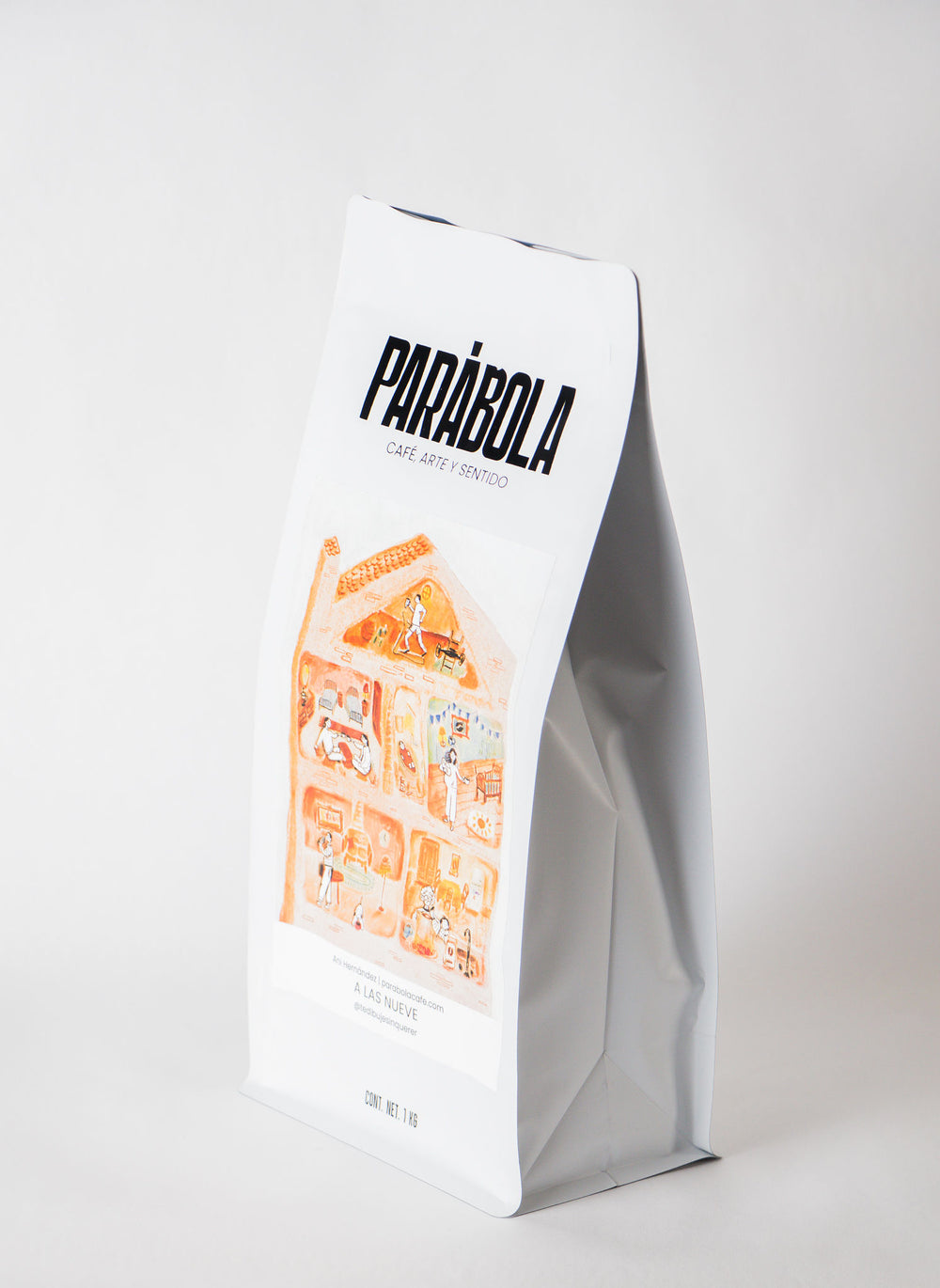 En esta obra, Ani nos ofrece una serie de escenas a la vez íntimas y cotidianas. Nos abre la posibilidad de entrar al espacio privado, permitiéndonos abarcar con la mirada distintas habitaciones de una casa de tres pisos. Con su estilo particular, nos ofrece distintas historias conectadas no solamente por el mismo techo y quizás por los lazos sanguíneos, sino también por la bebida que está presente en cada una de sus escenas: el café. Con un sinfín de detalles por ser descubiertos, esta obra nos invita a detenernos para explorar su múltiples tramas y elementos. En ella lo cotidiano se nos refleja con la posibilidad de relacionarnos sin complicación con las historias que amablemente se nos muestran con su estilo pictórico característico, donde podemos sentirnos en un ambiente de inocencia, sin que exista en él rastro alguno de ingenuidad. "A LAS NUEVE" nos sugiere algo que el amante del café reconoce: el café nos une, nos acompaña, es parte de la cotidianidad de la vida, y forma parte también de los mejores momentos.